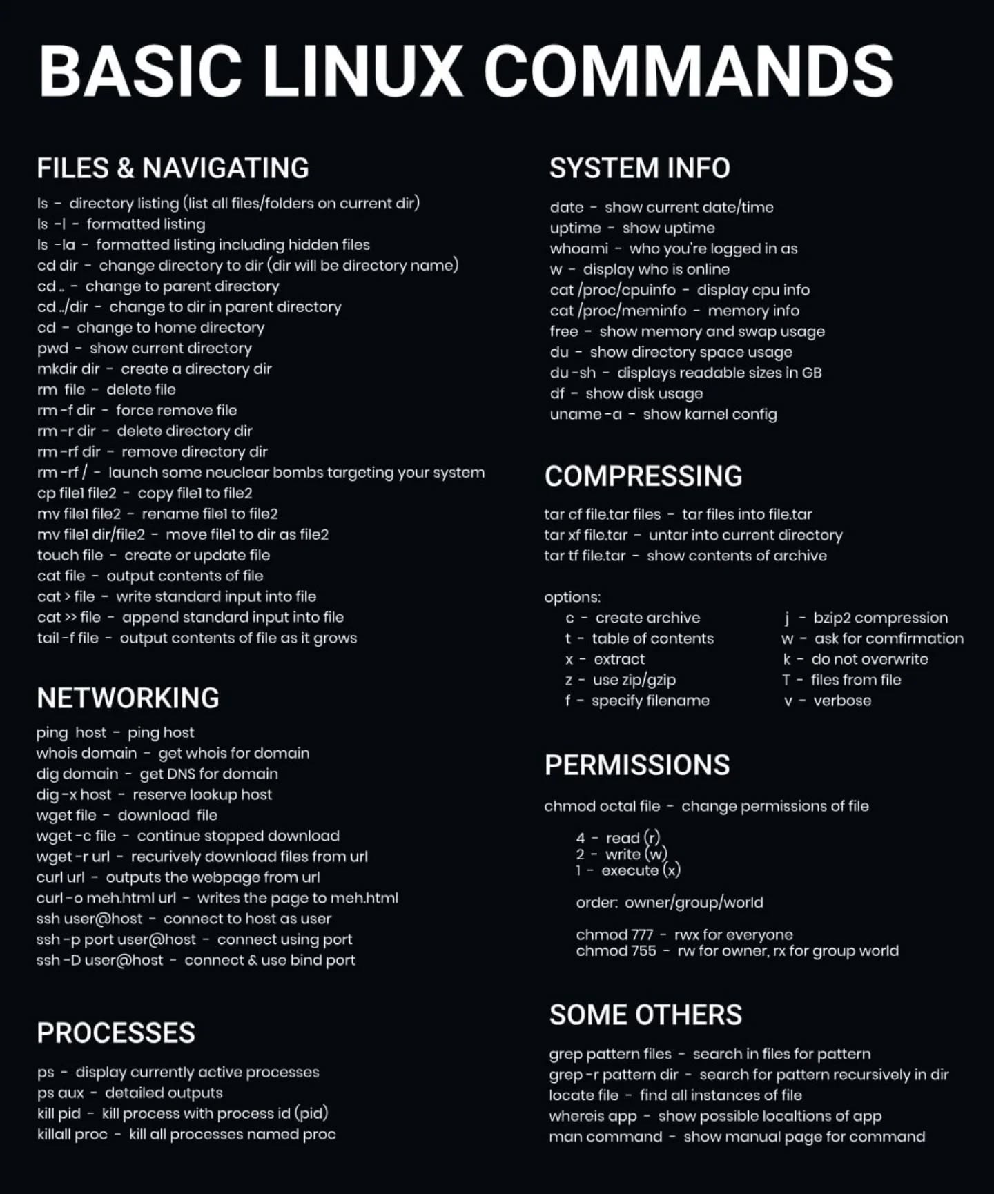 Linux is a powerful and versatile operating system widely used in servers, development environments, and cloud systems. Whether you’re a beginner or looking to refresh your skills, mastering basic Linux commands is essential for navigating the file system, managing processes, checking system information, and handling networks or files efficiently. This cheat sheet provides a quick reference to commonly used Linux commands, organized by category for easy access.