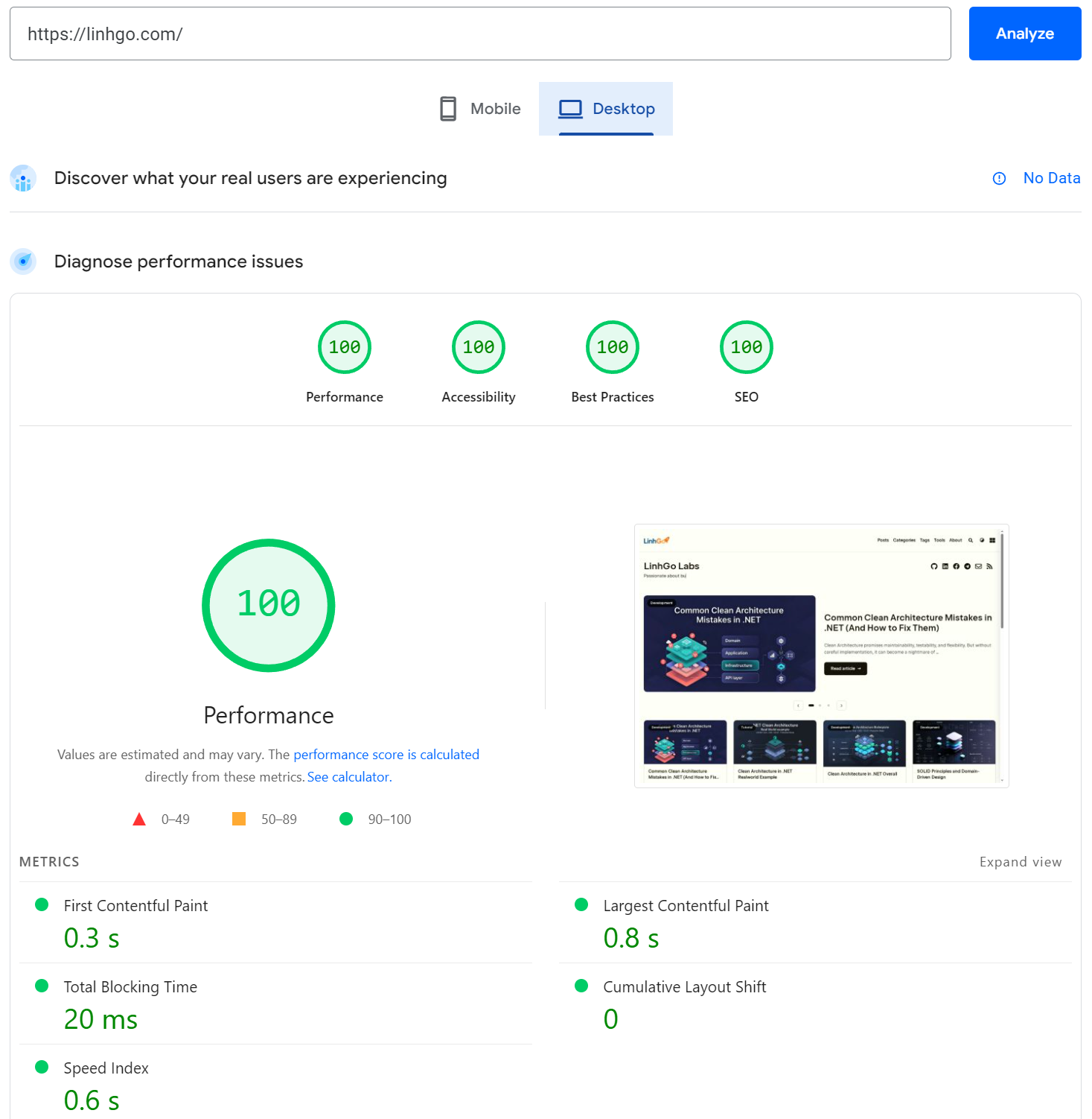 Here’s our final PageSpeed Insights score for linhgo.com after optimization: